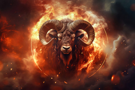 Inflamed Aries zodiac sign in red misty backdrop. An intense gaze of a ram surrounded by flaming reds and oranges on a dark background.