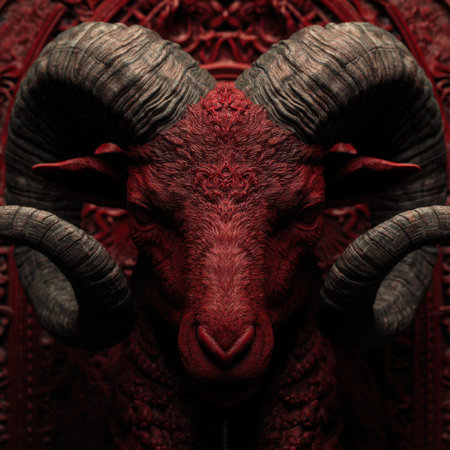 A highly detailed red ram sculpture featuring intricate textures and prominent horns. The artwork showcases a blend of realism and artistic design, emphasizing the ram's majestic presence.