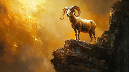 A majestic ram stands proudly on a rocky cliff, bathed in golden light. This stunning image captures the essence of wilderness, beauty, and adventure in nature.