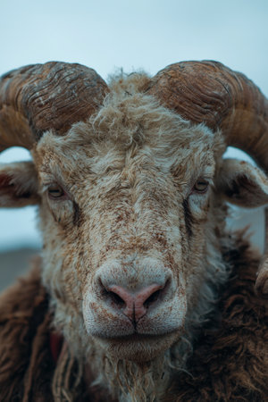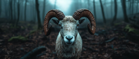 Close-up portrait of a majestic ram showcasing its impressive curved horns and striking features against a dark background, representing wildlife's beauty and strength.