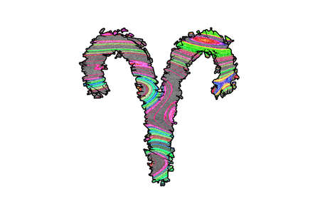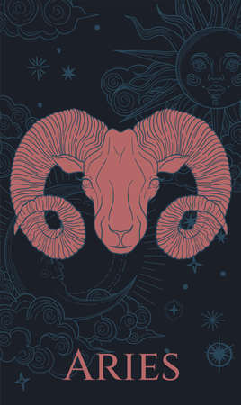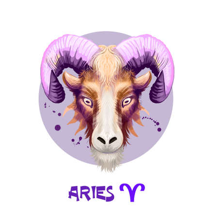 Creative digital illustration of astrological sign Aries. First of twelve signs in zodiac. Horoscope fire element. Logo sign with ram horns. Graphic design clip art for web and print. Add any text