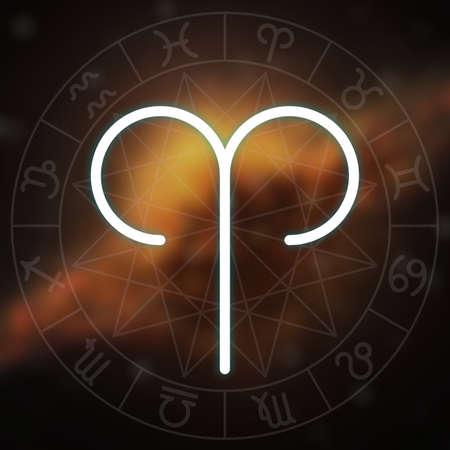 Zodiac sign - Aries. White thin simple line astrological symbol on blurry abstract space background with astrology chart.