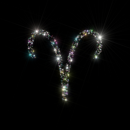 Abstract backdrop astronomy / astrology illustration representing zodiac sign / symbol for Aries constellation made of twinkling sparkling variegated / varicolored stars isolated on black background.