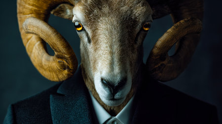 A sophisticated goat with human characteristics stands under intense, moody lighting, dressed sharply in a tailored suit, exuding confidence and intrigue.