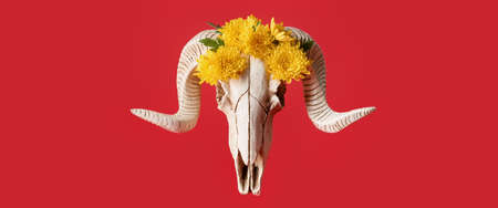 Skull of sheep with flowers on red background