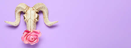 Skull of sheep with flower on lilac background with space for text, top view