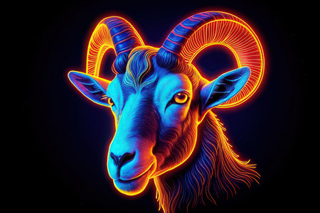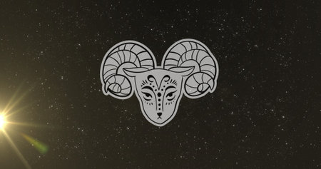 Image of sheep of aries zodiac sign over star field sky and illuminated flare. Ram, illustration, digitally generated, abstract, astrology sign, fortune telling and outer space concept.