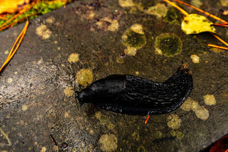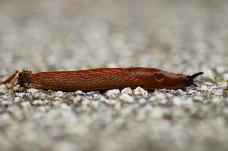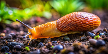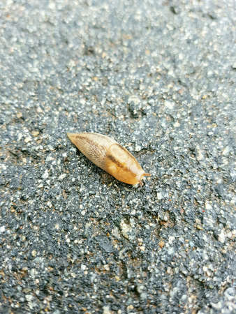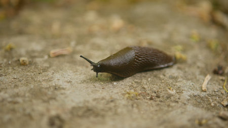 snail crawling on the ground, closeup of a slug crawling on the ground