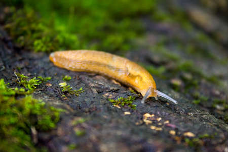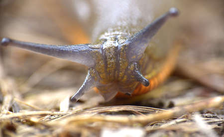 Snaile without a shell on the dirt-track in macro close-up blurred background