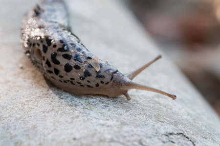 Intimate close-up of a leopard slug gliding slowly across a rough stone surface, showing its distinct black-speckled shell and delicate antennae, ideal for nature illustration