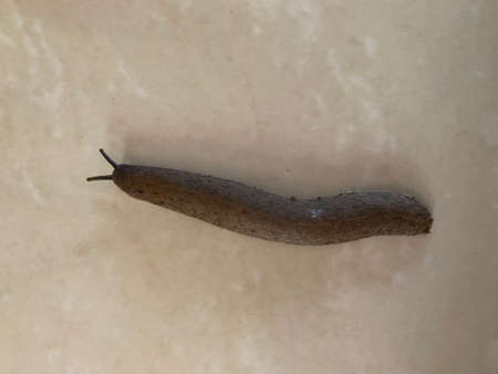 Slug, limax on hard texture slide with head up. Black and white animal photo