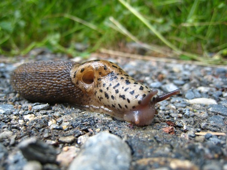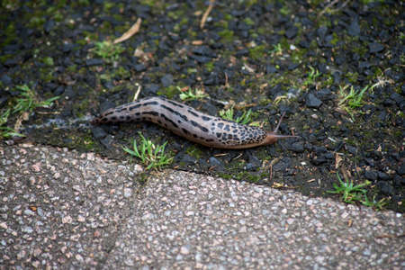 Limax maximus, literally, largest snail, known by the common names great gray snail and leopard snail, on the sand