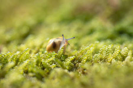 A snail crawls on a mushroom in a clearing with green moss in the forest close-up.