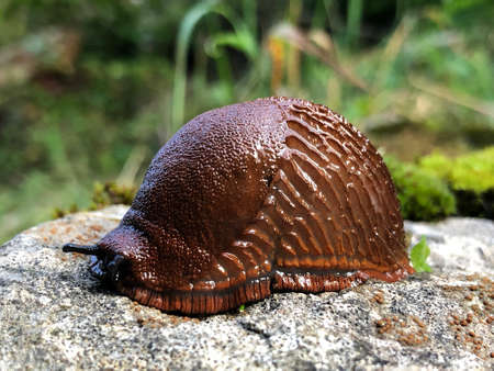 Red Spanish slug (Arion vulgaris) crawling on a stone in the garden, the mollusc animal is a feared pest among gardeners and also causes eating damage in agriculture, copy space, selected focus