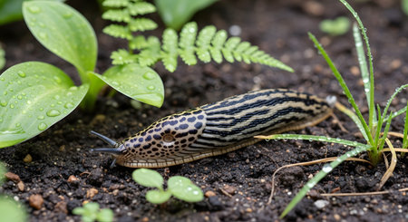 A large leopard slug crawls across dark, damp soil among small green seedlings. The macro photograph details the spotted pattern and slimy texture of the gastropod in its natural habitat.