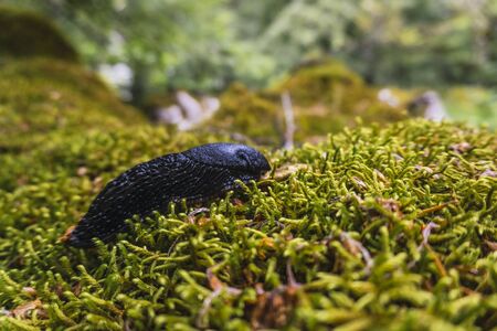 Mount Aizkorri 1523 meters, the highest in Guipuzcoa. Basque Country. Ascent through San Adrian and return through the Oltza fields. A black slug in the forest of Mount Aizkorri