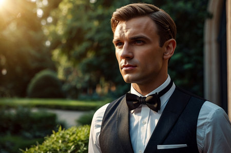 Portrait of confident businessman young guy in vest and bow tie posing at greenery park, strong look. Serious fashionable stylish man in tuxedo, luxury image James Bond style. Copy ad text space
