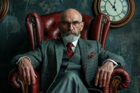 Sophisticated elder man with a beard poses in a classic style study room, exuding confidence