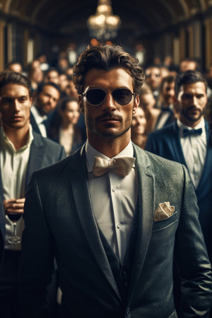 Handsome young man in elegant suit and sunglasses on the background of the crowd of people