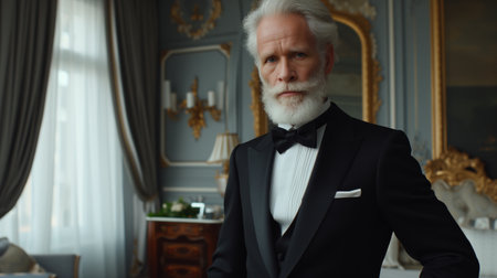 Distinguished senior man in a tuxedo and glasses with a classic beard style
