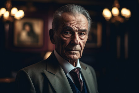 Portrait of an old man in a suit in a dark room
