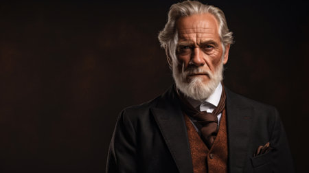 An old man with a long white beard and hair wearing a suit and tie. He has a thoughtful expression on his face and is looking at the camera. The background is a dark brown color.