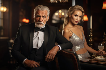 A distinguished man and an elegant older woman pose together at a formal gathering. They showcase refined fashion with the woman wearing a stylish dress and pearls while the man dons a classic tuxedo. The warm lighting creates a beautiful atmosphere.