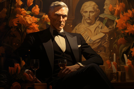 A man in a tuxedo sitting on top of an arm chair, AI