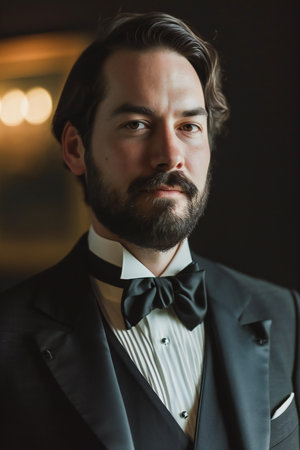 Portrait of a handsome man with a beard and mustache in a tuxedo