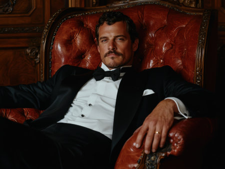 Elegant man in tuxedo sitting in leather armchair.