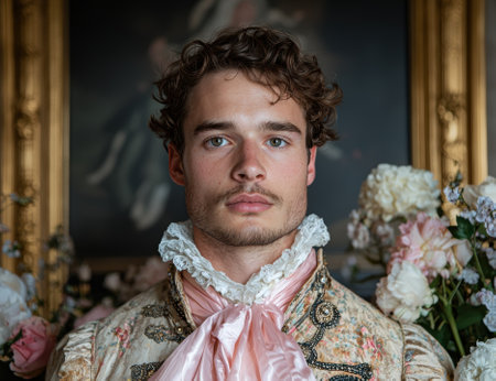 Portrait of a man in historical clothing with floral decorations.
