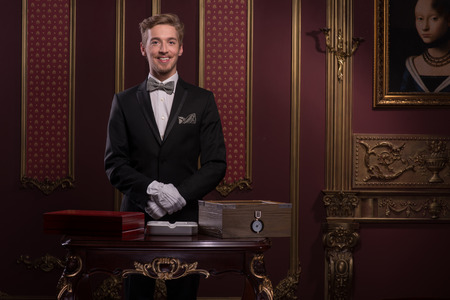 Half-length portrait of handsome young fair-haired smiling man wearing classic costume and white gloves standing at the expensive wooden table looking at us
