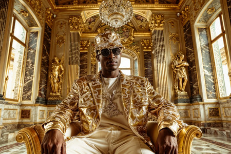 Stylish rapper exudes opulence in a luxurious gold-adorned room
