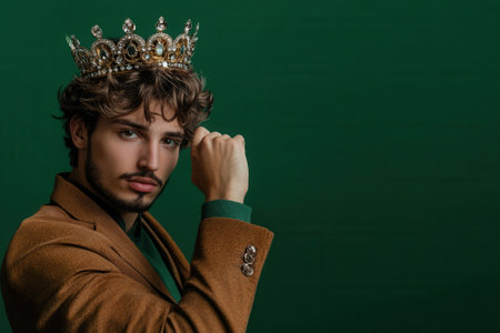 A stunning golden crown rests on a plush red cushion, set against a rich green background. The elegant lighting highlights its intricate details, evoking themes of royalty and grandeur. Perfect for projects related to historical or celebratory concepts.