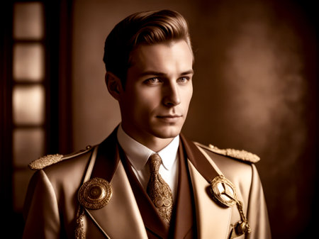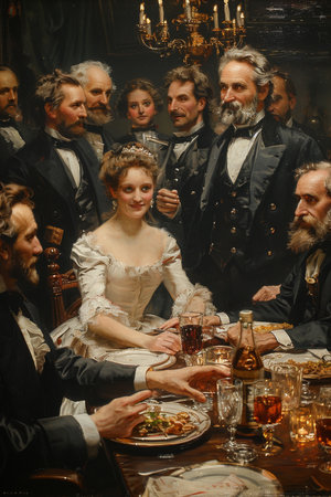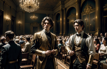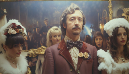 A man stands prominently in the foreground of the image, dressed in a vintage suit complete with a bow tie and floral decoration on the lapel. The man’s expression is serious, and he is surrounded by women in elegant, period-appropriate costumes. The background is slightly blurred, featuring a lavish, ornate mirror and additional people who appear to be at a gathering or event. The lighting is soft and ambient, suggesting an indoor setting that conveys a sense of sophistication and historical context. The women around him have elaborate hairstyles and accessories, contributing to the overall opulent and theatrical ambience. The setting evokes a scene from a historical drama or a high-society gathering from a past era.