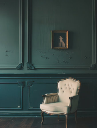 An elegant antique chair is positioned below a beautifully framed portrait on a sophisticated gallery wall in a dimly lit space