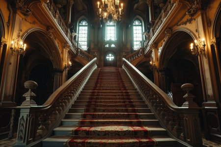 This image showcases the interior of a grand and opulent mansion,featuring a stunning hallway with intricate architectural details,including a magnificent staircase,ornate wood paneling,and a