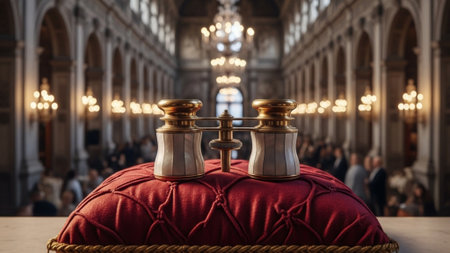 An environmental cinematic wide shot (16:9) capturing a pair of vintage brass and mother-of-pearl op