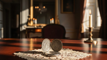 A beautifully engraved coin reveals a regal figure, showcasing intricate designs and textures. Soft light illuminates the metallic surface, highlighting artistry and historical significance.