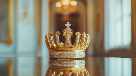 This image features an ornate golden crown embellished with sparkling gems and a cross, resting on a reflective surface in a luxurious setting.