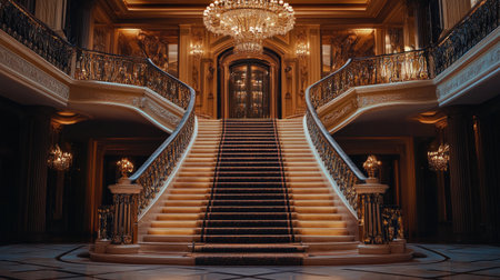Grand staircase with ornate railings in a luxurious hotel lobby, illuminated by a grand chandelier.