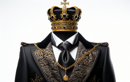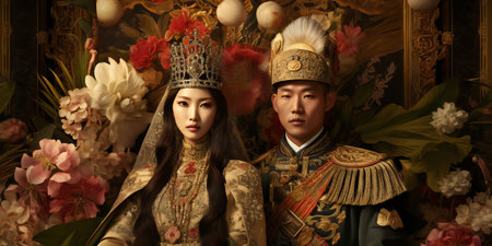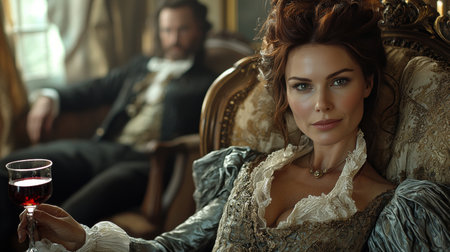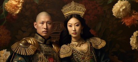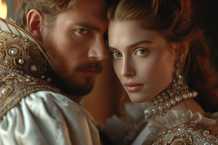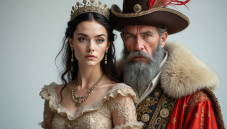 A striking couple stands together, exuding elegance and authority, dressed in luxurious historical costumes. The woman, adorned with a delicate crown and intricate jewelry, complements the man’s majestic fur-lined coat and elaborate hat, creating a captivating scene of royal grandeur.