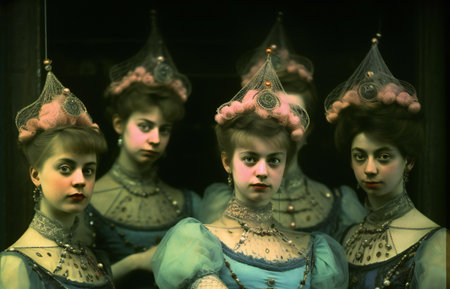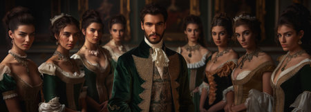 Echoes of a Royal Past. Portrait of handsome man standing with six beautiful women on dark background