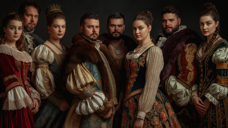 Group of people in medieval historic clothes posing on dark background. Aristocratic portrait