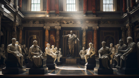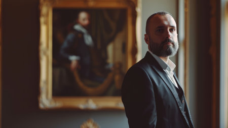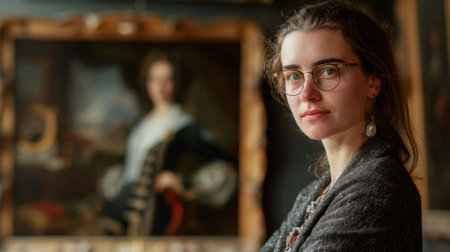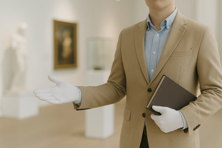 AI generated An elegant curator stands at the frame's edge gesturing toward a spacious museum gallery filled with art and artifacts. The sophisticated atmosphere conveys cultural heritage, artistic