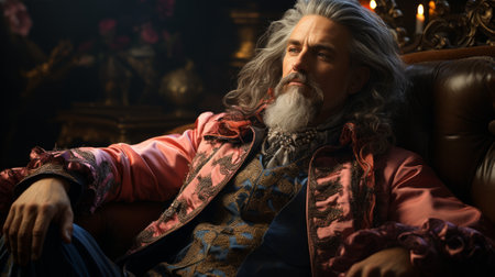 A wise old man with a weathered face and flowing beard sits in contemplation, his simple clothing and rugged features reflecting a life of wisdom and experience, as a woman looks on in awe
