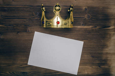 VIP agreement. Premium contract. Special offer. Blank paper sheet and golden crown on wooden table background.