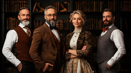 A steampunk family poses confidently in front of ornate bookshelves, showcasing intricate outfits, elegance, and warmth. The atmosphere feels sophisticated yet inviting.
