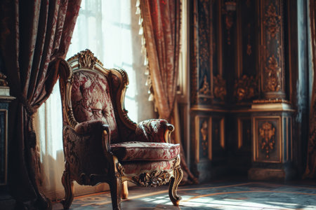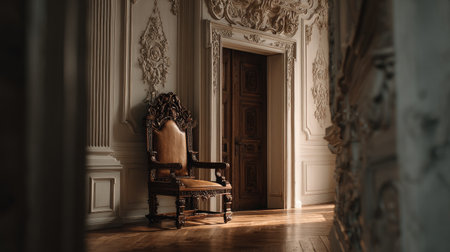 This stunning image depicts an elegant vintage chair in a luxurious historic room, showcasing intricate architectural details bathed in soft natural light.