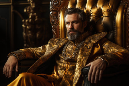 Male businessman on a throne in golden clothes, concept of success, mani of greatness